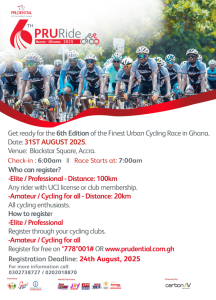 The 6th edition of PruRide, Ghana’s premier cycling event organized by Prudential Life Insurance Ghana in partnership with the Ghana Cycling Federation, was officially launched on June 27, 2025, at the company’s headquarters in Accra. The main event is slated for Sunday, August 31, 2025, at the iconic Black Star Square.