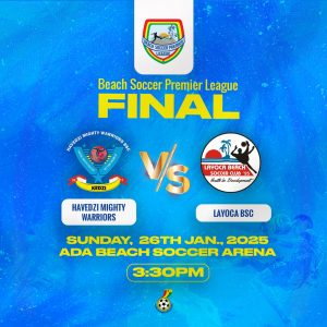 The stage is set for an electrifying finale as Layoca Beach Soccer Club (BSC) prepares to face Havedzi Mighty Wrriors BSC in the much-anticipated Beach Soccer Championship Final on Sunday at the Ada Beach Soccer Arena.
