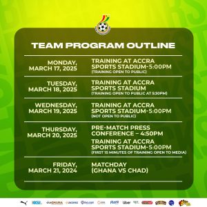 The Ghana Football Association (GFA) has unveiled the Black Stars’ training schedule ahead of their crucial 2026 FIFA World Cup qualifier against Chad on Friday, March 21, 2025.
