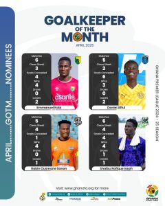 The Ex-National Goalkeepers Union has officially unveiled the four standout contenders for the April edition of the Ghana Premier League Goalkeeper of the Month award, highlighting exceptional performances that contributed significantly to their teams’ campaigns.