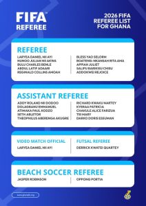 Experienced referee Daniel Laryea remains a key figure on the list, earning continued trust from FIFA as both a Centre Referee and a Video Assistant Referee. The 2026 roster also introduces fresh faces, with Richard Kwaku joining the assistant referees, while Portia Oppong secures her place among FIFA-recognised Beach Soccer officials.