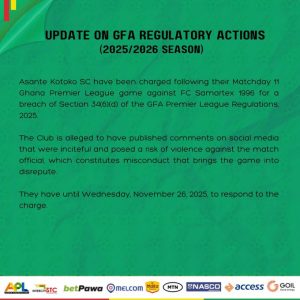 Per the GFA’s charge sheet, the club’s posts were considered inflammatory and likely to incite negative sentiments toward the match officials. The charge was issued under Section 34(6)(d) of the Premier League Regulations, which addresses conduct that tarnishes the image of the game. Kotoko have until Wednesday, November 26, 2025, to formally respond.