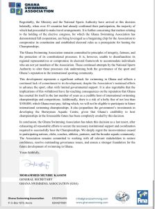 The Association expressed regret over the disruption caused to athletes, participating nations, and stakeholders, while reaffirming its commitment to resolving internal challenges and restoring confidence in the administration of swimming in Ghana.