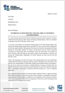 Ghana Swimming Association has officially announced Ghana’s withdrawal from hosting the 2026 African Swimming Championships, pointing to unresolved governance issues and insufficient institutional backing.