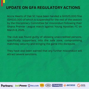 Accra Hearts of Oak have been fined GHS20,000 by the Ghana Football Association (GFA) Disciplinary Committee for a security lapse during their Ghana Premier League fixture against Young Apostles FC on March 8, 2025.