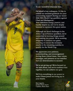 Ghana secured back-to-back wins against Chad and Madagascar, boosting their chances of securing a spot in the upcoming World Cup. After the matches, Ayew issued a statement assuring Ghanaians of the team’s unwavering commitment.