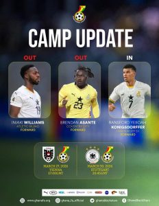 Black Stars have been forced into a late squad adjustment after injuries ruled out two attacking options ahead of their international friendlies.