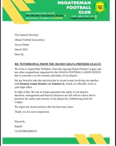 Nsoatreman FC emphasized that it can no longer guarantee the safety of its players, leaving management and the board of directors with no alternative but to withdraw from the league.